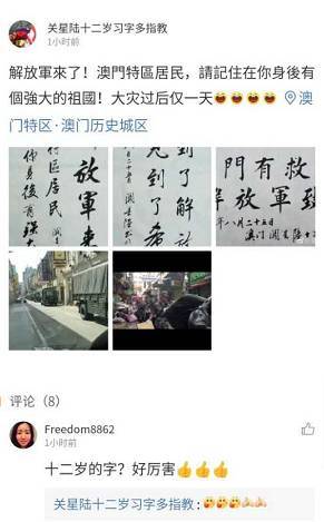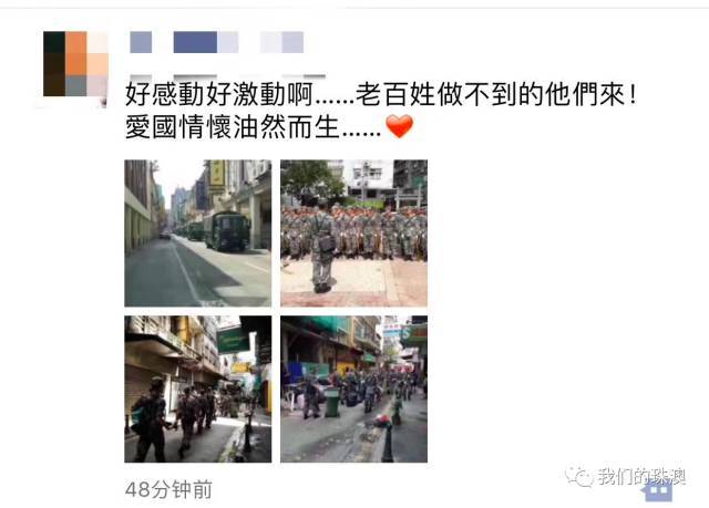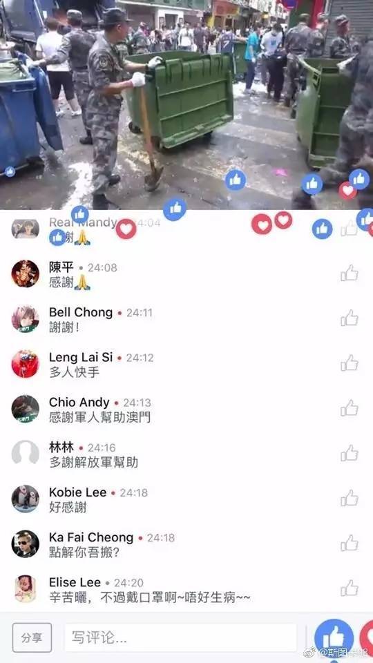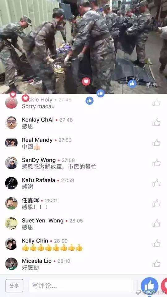 看见解放军来救灾,澳门居民纷纷为其点赞!有民众感慨,“解放军出来救灾啊,劲(给力)啊”。 ![]() ![]() 大家的朋友圈刷屏了! ![]() ![]() ![]() ![]() ![]() 香港橙新闻报道称,澳门某小学家长群里也沸腾了! ![]() 澳门网络直播解放军驻澳部队协助救灾,澳门网民的评论↓ ![]() ![]()