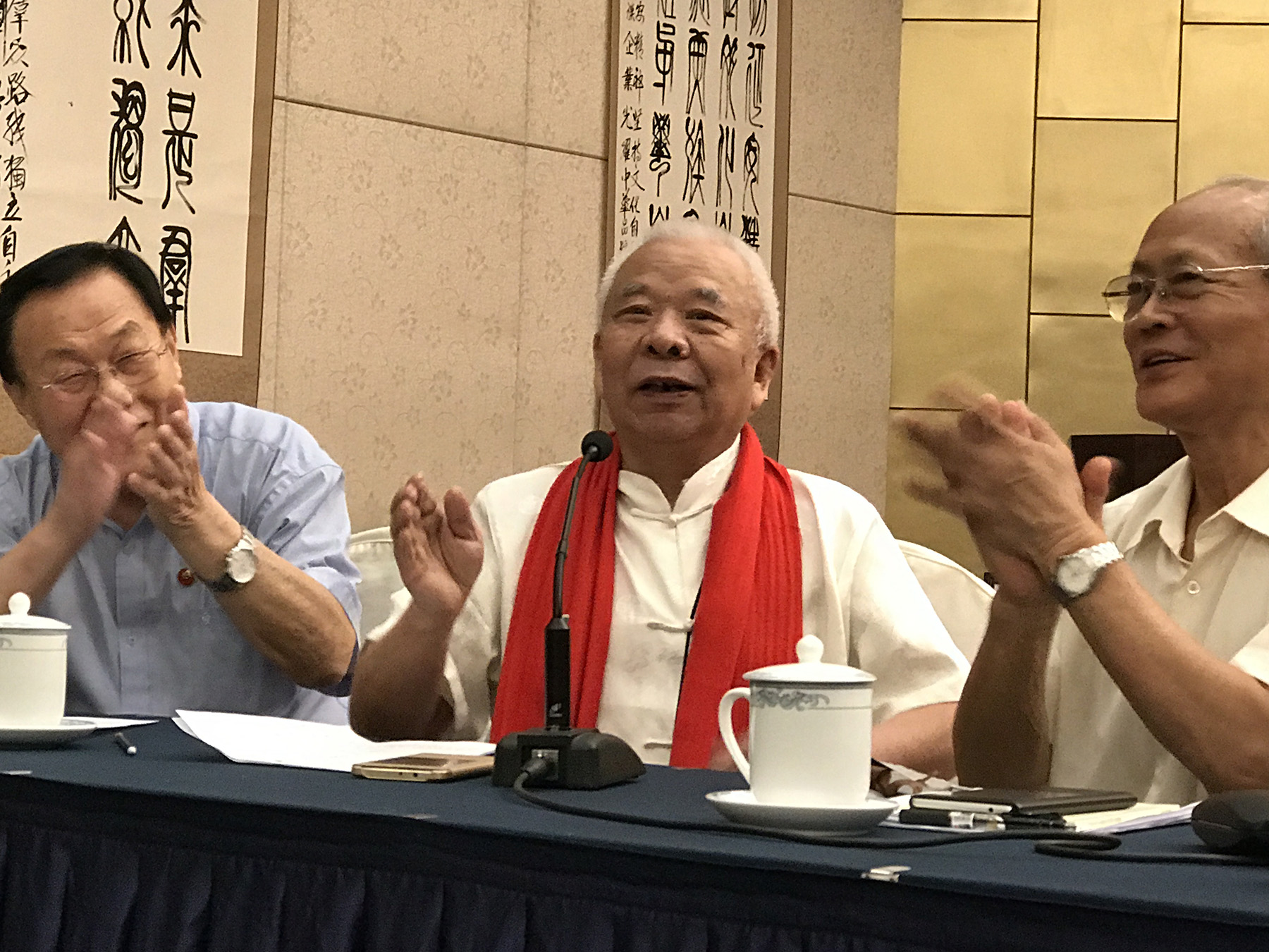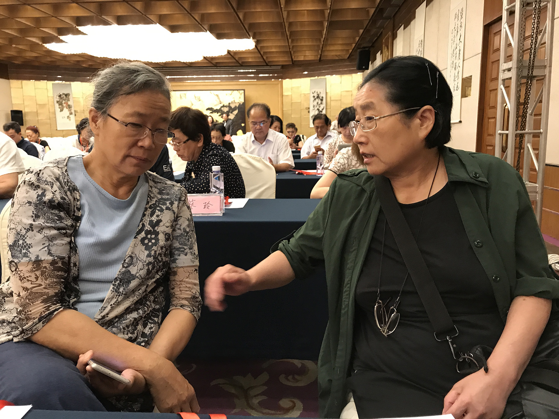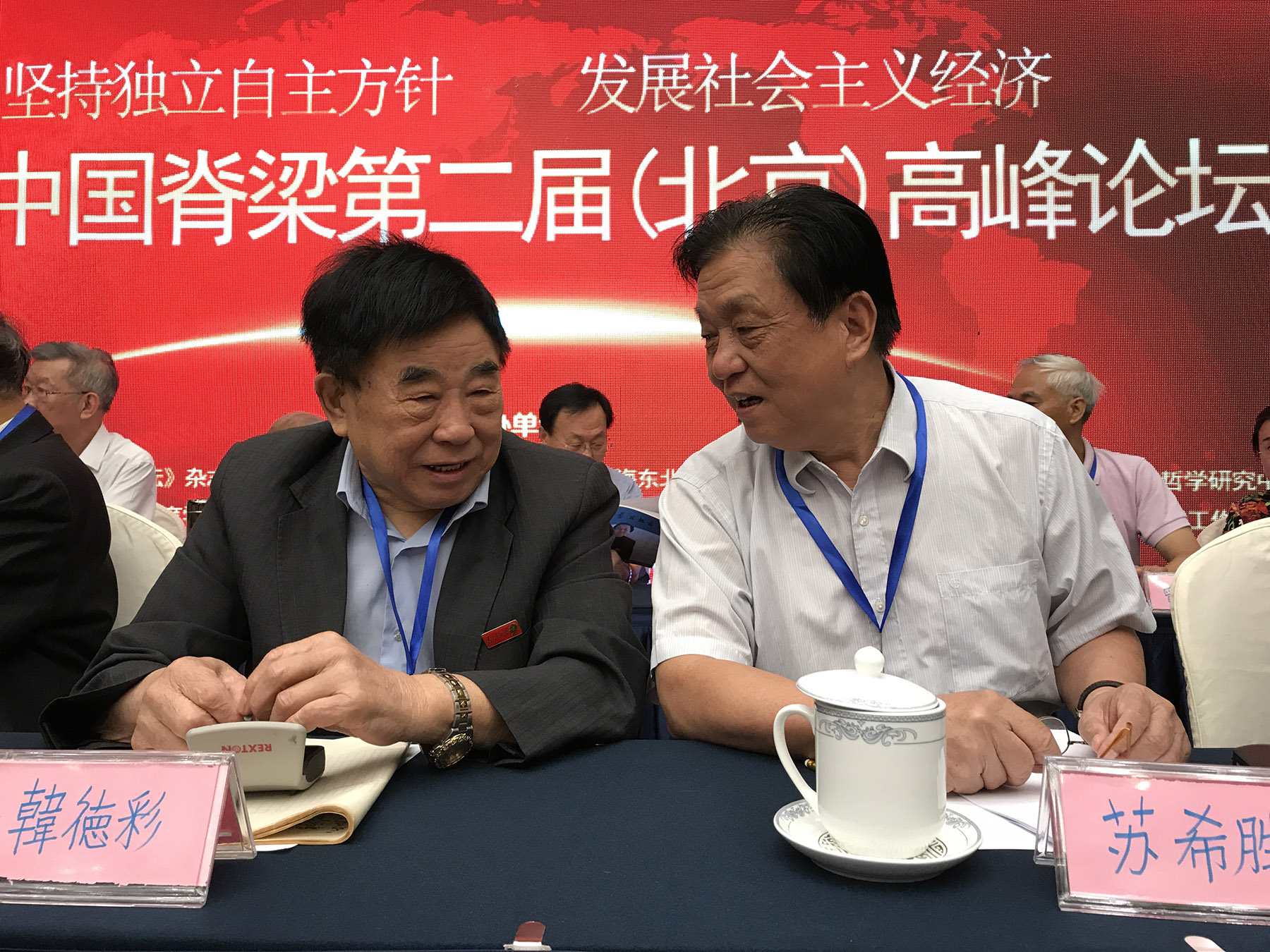 ![]() 顾秀林(基因问题专家,左)与贾爱春(重返插队农村创办农机合作社的老知青)在会议上交谈。 |