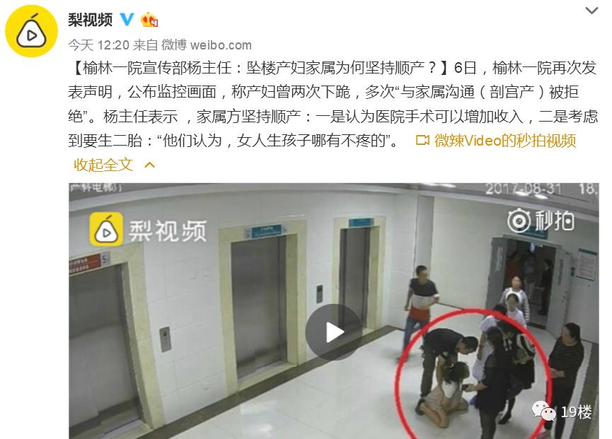 日前发生在陕西榆林市的产妇跳楼身亡事件,由于家属和医院双方就“谁拒绝了剖腹产”这一关键环节各执一词,使事件陷入了扑朔迷离的“罗生门”。 最新消息:这起事件所涉主治医生已经被停职,以配合警方调查。当地卫计部门也已经介入调查。 榆林一院杨主任 产妇家属为要二胎坚持顺产 榆林一院宣传科的杨主任接受采访表示,家属方坚持顺产,可能有两个原因:一是认为医院手术可以增加收入,二是考虑到要生二胎。 “他们认为,女人生孩子哪有不疼的,谁没疼过呢”。 ▼以下截图来自微博@梨视频