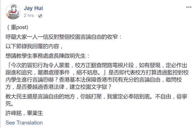 不过,令耿直哥觉得最魔幻的是,一名香港教育大学的毕业生以及该校前学生会的“副主席”,居然拿出“民主自由”的大棒,宣称学校要查找谁发布这番恶毒言论的做法是“要对学生进行恐吓”和“文字狱”,还说自己必会捍卫校园民主墙的“言论自由”,与学校“奉陪到底”。