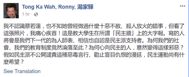 据悉,蔡女士会遭到如此攻击,与她之前曾多次发表过支持香港学校多教普通话,以及让学校多让学生了解和认识中国与中国发展模式的言论可能有很大关系,因为这些言论引起了“港独”分子和反内地人士的敌视,多次攻击她要“赤化香港”。 可如若因为不认同她的观念,就为身为母亲的她失去爱子而欢呼,这就只能用“没人性”来形容了。所以,目前香港教育大学的恶毒标语事件已经彻底震惊了香港教育界乃至香港社会,香港教育局称这一言论太“歹毒”,香港教育大学的校长则认为发表这番言论的人根本“不是人”,并以要求学校立刻翻查闭路电视,找到是谁发表的这番言论。 许多香港社会名流也对这一言论表达了愤怒之情,比如香港知名大律师汤家骅就在他的Facebook页面上写到: