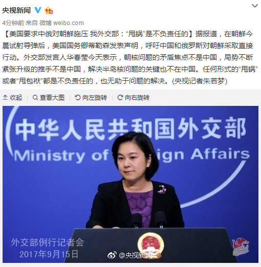 据报道,在朝鲜今晨试射导弹后,美国国务卿蒂勒森发表声明,呼吁中国和俄罗斯对朝鲜采取直接行动。外交部发言人华春莹今天表示,朝核问题的矛盾焦点不是中国,局势不断紧张升级的推手不是中国,解决半岛核问题的关键也不在中国。任何形式的“甩锅”或者“甩包袱”都是不负责任的,也无助于问题的解决。