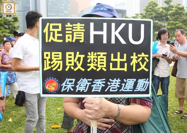 集会人士展出标语,促请港大革除戴耀廷教职。(图片来自港媒) 报道称,何君尧表示,戴耀廷提出违法“占中”后,引起一系列不安宁及暴动事件,而近日大学出现冷血的言论,有违教育精神,罪魁祸首是戴耀廷。何君尧斥责戴耀廷挑战法律精神,教人犯法,导致社会大乱,戴耀廷搞“占中”导致“港独”思潮出现,而“占中”距今数年,须拨乱反正,革除戴耀廷教职。对于戴耀廷的案件即将审理,何君尧否认向法庭施压。 何君尧指出,港大校长马斐森13日曾回覆他,会按既定程序和政策处理有关事情,但并无说明是否正式接受何的投诉,何君尧同日已要求马斐森澄清是否展开投诉机制,希望港大尽快答覆。