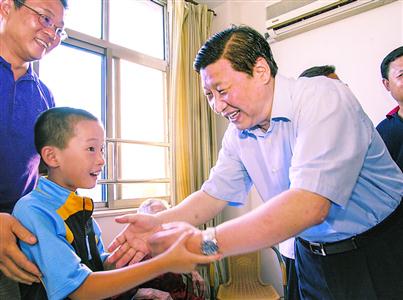 2007年10月6日,习近平来到浦东新区爱心养老公寓,与正在看望长辈的小朋友热情握手。 本报记者 郭天中 摄