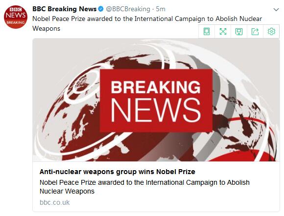 据BBC消息,非政府组织“国际废除核武器运动”(ICAN)获2017年诺贝尔和平奖。据悉,国际废除核武运动(International Campaign to Abolish Nuclear Weapons)十年来致力让原子弹走入历史,也是今年122国签署的禁止核子扩散条约(NPT)重要倡导者。