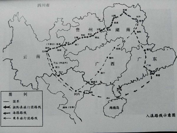 1938年2月19日下午,在长沙临时大学圣经学院操场举行开拔仪式后,由学生、教师、医生、临时招募的雇工335人组成湘黔滇旅行团正式出发。 张治中派来中将参议黄师岳担任旅行团团长,他原是东北军的师长,西安事变后调到军委会任参议虚职。临行动员,黄师岳直言,这次“行军”的重大意义,可与历史上的张骞通西域、玄奘游天竺和郑和下西洋相比。 三千里征程 湘黔滇旅行团从长沙经益阳、常德、桃园、芷江、晃县(今新晃),贵州玉屏、贵阳、镇宁、平彝(今云南富源县),最后到达昆明。一路如闻一多所说“既得经验,又可以省钱”。 ![]()