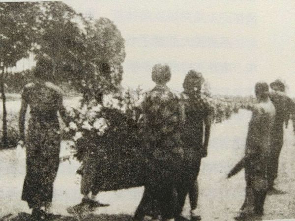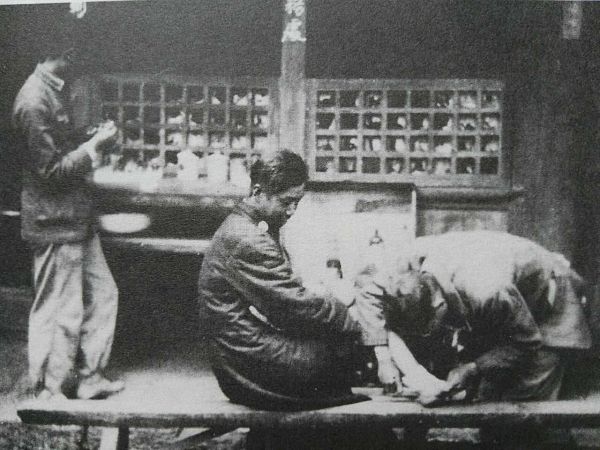 医疗服务队为团员挑水泡。 引自《联大长征》