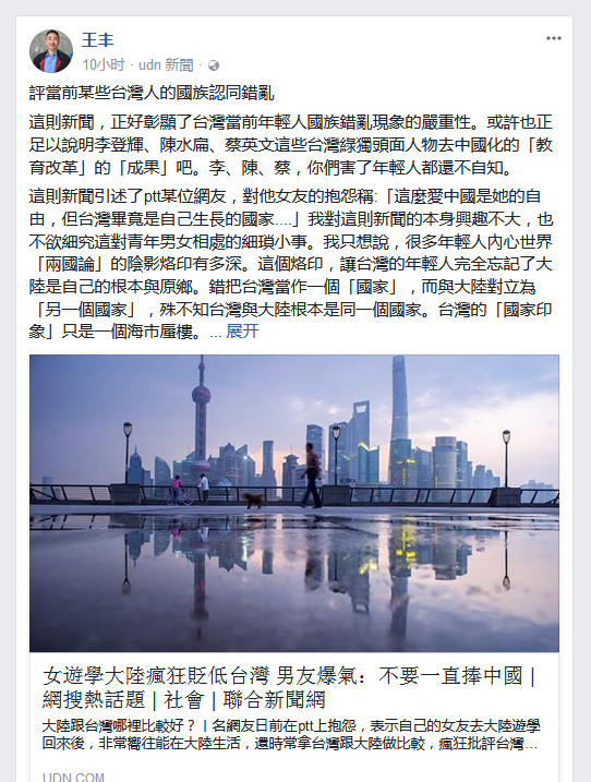 王丰在脸书上发文批评岛内“国族错乱”现象(图片来源:王丰Facebook)