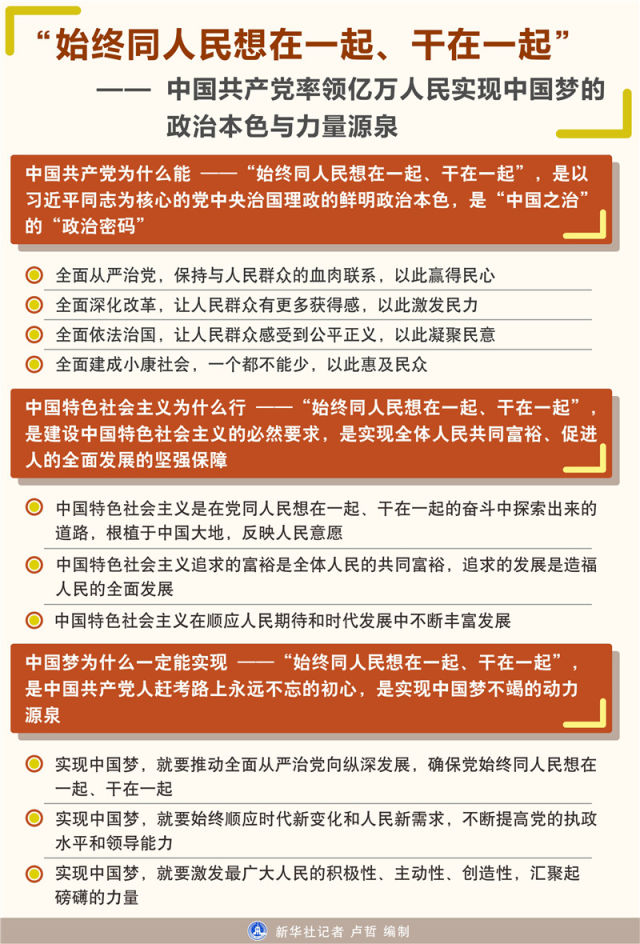 党的十九大召开在即。这个有着8900万党员的世界最大执政党将率领13亿人民,决胜全面建成小康社会,踏上建设社会主义现代化国家新征程。 7月26日,习近平总书记向全党发出意味深长的号召:“确保党始终同人民想在一起、干在一起,引领承载着中国人民伟大梦想的航船破浪前进,胜利驶向光辉的彼岸。” 近百年的苦难辉煌昭示:只要我们党始终坚持以人民为中心,始终同人民想在一起、干在一起,就一定能够不断从胜利走向更大的胜利! 中国共产党为什么能——“始终同人民想在一起、干在一起”,是以习近平同志为核心的党中央治国理政的鲜明政治本色,是“中国之治”的“政治密码” 10月1日,美国拉斯维加斯响起枪声,59条生命戛然而止。 近年来,一些西方国家治安状况恶化,经济复苏乏力,政坛恶斗加剧,社会分裂加深……西方模式正面临严峻挑战。 与此形成鲜明对照的是,党的十八大以来,中国经济实力、科技实力、国际影响力不断迈上新台阶。 很多人都在思考这样一个问题:“西方之乱、中国之治”背后根源何在?