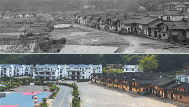 拼版照片:上图为改造前的江西省瑞金市叶坪乡华屋村(资料图片,2012年摄);下图为改造后的华屋村(2017年8月17日)。新华社记者万象摄 上世纪30年代初,华屋村17名青年参加红军,相约栽下17棵松树。革命途中,他们壮烈牺牲,这些松树被称为“信念树”。 时空穿越,这片松树承载着党和人民拧成一股绳的理想信念,也见证了今天党带领人民奔小康的决心。 今日华屋村,村民在田间建起果蔬大棚,公路能直通瑞金城区…… 党和人民心往一处想、劲往一处使,一人、一村、一市的面貌变化,都印证着中国特色社会主义事业不断迈进的步伐。 中国特色社会主义追求的富裕是全体人民的共同富裕,追求的发展是造福人民的全面发展。