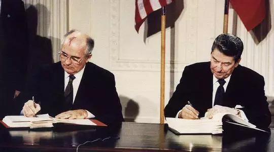 1987年,里根和戈尔巴乔夫在白宫东厅签署《中程导弹条约》。