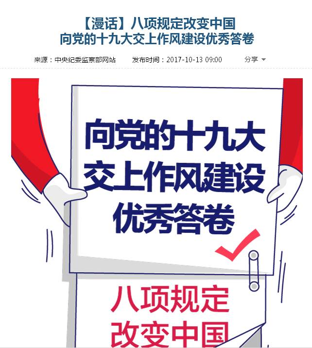 最后是“数读十九大报告短视频”系列,每个小视频大概一两分钟,介绍十九大报告中的重点数字,目前已经公布了6期内容。 官网的变与不变 用各种形式介绍一件事儿,中央纪委官网也是驾轻就熟了。 比如说,十八大以来纪委工作的总结,官网就用了不少方式来说明。 比如“一图读懂”系列有“一图读懂:党的十八大以来巡视工作大事记”、“一图读懂:数说正风反腐这五年”;【漫话】系列有“打虎拍蝇:无禁区,全覆盖,零容忍!向党的十九大交上惩治腐败优秀答卷”、“八项规定改变中国,向党的十九大交上作风建设优秀答卷”;还有从数字角度说的“从数字看十八届中央巡视取得了哪些成效”等等。