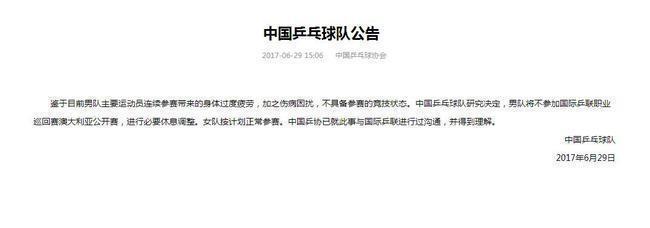 >>最新消息 国际乒联处罚男乒退赛:取消禁赛 罚款2万美金 北京时间10月31日消息,国际乒联对中国乒乓球男单三位名将马龙、许昕、樊振东在6月的中国乒乓球公开赛擅自退赛一事做出决定,给予三人罚款20,000美金的处罚。 6月23日,2017国际乒联世界巡回赛中国公开赛男单第二轮比赛在成都举行,而当天的比赛中,中国乒乓球男队的2名教练员、3名运动员宣布弃赛,这引发了轩然大波。 鉴于退赛事件对国际乒联声誉以及社会各界造成的负面影响,国际乒联调查小组考虑给予马龙、樊振东、许昕禁赛一个月的处罚决定。不过,鉴于选手良好的认错态度,以及中国乒乓球协会的积极配合,调查小组最终决定给予马龙、樊振东、许昕罚款20,000美金的处罚。 ![]() >>乒协回应 汲取教训 加强思想作风建设 原文如下: 北京时间2017年10月31日,国际乒联对成都中国公开赛擅自退赛的3名运动员马龙、许昕、樊振东,处以每人20,000美元罚款,同时希望他们今后严格遵守国际乒联规定,积极参加公益活动,树立良好形象,发挥榜样作用。 中国乒乓球协会尊重并服从国际乒联的处理意见,支持国际乒联所提出的建议。中国乒乓球协会将认真汲取教训,进一步加强国家队思想作风建设,强化爱国主义、集体主义教育,传承和弘扬中国乒乓球队艰苦创业、顽强拼搏、为国争光的精神,争做社会主义核心价值观的表率,以争取优异成绩的实际行动为己任,不辜负社会各界的支持和厚爱。 ![]() >>事件回顾 国乒退赛风波 北京时间6月23日,中国公开赛继续进行,男队在暂时结束一段比赛后,突然集体在微博发声:我们无心恋战 只因想念您刘国梁!随后,国际乒联宣布,2017年国际乒联中国公开赛,中国选手马龙和樊振东相继退出男子单打比赛! 此前刘国梁从国乒总教练职位上卸任,转任中国乒协副主席。 ![]() 当晚赛前在球馆内能听到现场观众清一色的呼喊声:刘国梁!!! 据国际乒联报道,在晚上进行的男单比赛中,中国男单独苗许昕也退出比赛,在前之前,马龙和樊振东已经相继退出本次比赛。加上22日因伤退赛的张继科,男队在中乒赛上已经全军覆没。 ![]() >>相关回应 国际乒联回应:失望!会与中国乒协一起调查 国际乒联主席托马斯-维克特表示:"国际乒联对于世界上最顶尖的3位选手退出如此重大的比赛感到失望。我们会和中国乒协一起调查这次事件,以制定我们的行动方针。同时,我们仍然有世界级的选手在这次比赛中参与竞争,最后2天的中国公开赛依然会很精彩。" ![]() 国乒道歉:意气用事,擅自退赛,深感自责! 中国乒乓球协会官网6月24日晚上,登出一则国家乒乓球队的致歉信,在2017年6月23日晚举行的国际乒联世界巡回赛中国乒乓球公开赛(成都)男子单打16进8的比赛中,中国乒乓球队教练员秦志戬、马琳,运动员马龙、许昕、樊振东在不完全了解国家乒乓球队管理模式调整具体内容的情况下,意气用事,擅自退赛,我们深刻地意识到错误的严重性,造成了恶劣的社会影响,我们十分痛心并深感自责,诚恳地接受社会各界的批评,并真诚地向广大球迷和观众道歉。能及时认识错误,并公开道歉,值得肯定。 在乒协发表声明之后,中国乒乓球队也就中乒赛部分教练和队员退赛一事发布致歉信,次日凌晨,国乒教练员秦志戬、马琳,运动员马龙、许昕、樊振东集体在个人社交媒体转发了此封致歉信。 ![]() 体总紧急召开会议:运动员要明确给谁打球 2017年6月26日上午,体育总局召开紧急会议,就国际乒联成都中国公开赛国家男子乒乓球队3名主力队员弃赛一事以及近几天网上热炒相关事件召开紧急会议。 会议重点强调,任何一支国家队、任何一名运动员、教练员都要有祖国培养意识,都要有爱国主义、祖国至上这样一种情怀。弃赛、罢赛行为是严重错误的,是给国家抹黑,是极其错误的。 会议强调,我们的运动员、教练员,参加国际比赛发生这种状况,有损国家的形象,有损中国运动员的形象。我们的竞技体育要体现顽强拼搏精神。同时要明确为谁打球的问题--不是为某个人、不是为某个教练。 ![]() 刘国梁发声:拥护改革 27日晚,刘国梁在风波之后首次发声,在他自己的微博里,刘国梁一上来就开宗明义,强调:"坚决拥护习主席的各项深化改革方针,相信国家在习大大的领导下一定会越来越强大"。在文章最后,刘国梁再次强调"所有人紧密团结在党中央习主席的身边"。 ![]() >>再次退赛 身体过度疲劳+伤病困扰 北京时间6月29日消息,中国乒乓球协会在官网就男队集体退出澳大利亚公开赛发表公告,并表示主要原因是因为队员连续参赛身体过度疲劳,需要必要的调整休息。 ![]() >>严厉处罚 扣除25分,或无缘世乒赛 北京时间7月7日,国际乒联公布了最新一期的世界排名,中国三大主力马龙樊振东许昕继续垄断前三甲席位,但他们的积分细则当中却有轻微变动,三人各被罚掉25分的处罚,除此之外,国际乒联针对马龙、樊振东与许昕,还将进行进一步的商讨,很可能会进一步做出追加处罚。 (北京时间综合新华网、中新网、扬子晚报等报道) (责任编辑:日升) |
