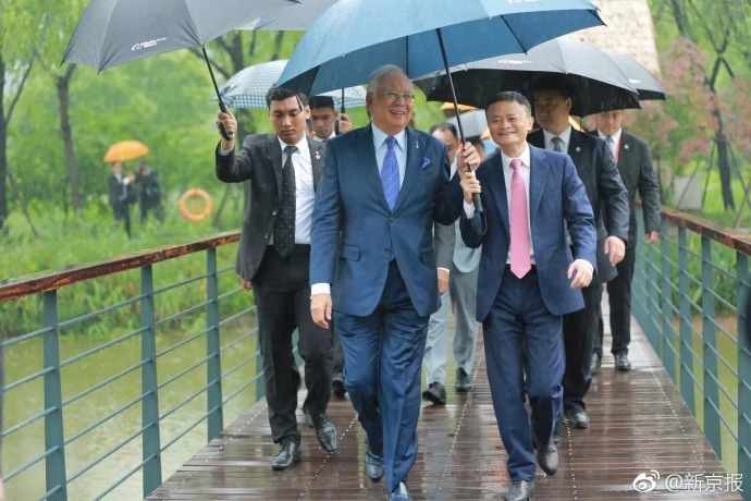 11月3日下午,随着纳吉布与马云共同鸣锣三声,阿里巴巴首个海外eWTP试验区——马来西亚数字自由贸易区在吉隆坡全面启用运营。 兴奋之余,纳吉布表达的是两人之间的友情。今年5月,纳吉布到访杭州阿里巴巴总部,和马云同坐一个沙发,一同竖起大拇指为合作点赞。到访时刚好下雨,两人还同撑一把伞。