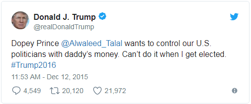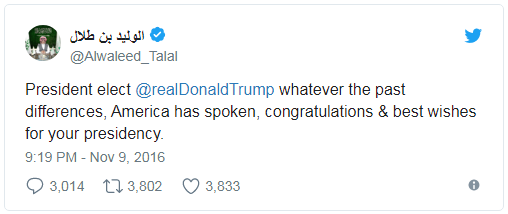 特朗普怎么可能示弱,立马回击道:“这个愚蠢的王子(此处艾特瓦利德)想用老爸的钱控制我们美国政治家。如果我当选的话,绝不允许这样的事情发生!” 然而,在特朗普当选之后,瓦利德王子的语气就变了,转而恭喜特朗普当选。