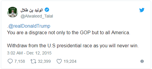 瓦利德王子在推特上唱衰特朗普,称其为共和党和全美国的耻辱。“赶紧退出大选吧,你赢不了的!”