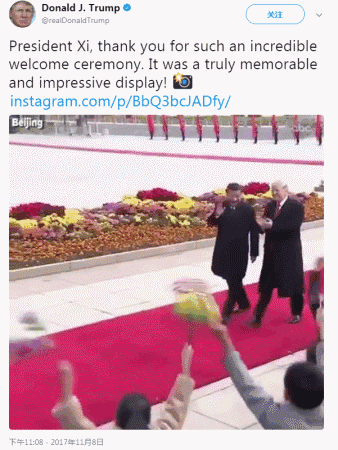 特朗普这样夸赞中国仪仗队:非常精彩,印象深刻 11月9日,三军礼兵列阵,枪刺如林。在人民大会堂东门外广场,国家主席习近平举行仪式欢迎美国总统特朗普访华,两国元首共同检阅了中国人民解放军三军仪仗队。 在随后举行的会谈中,特朗普总统用了这样一句话赞誉三军仪仗队——“今天上午仪仗队非常精彩,全世界都看了,我已经接到世界各地的朋友的电话,他们都看了,真的是很美,再一次非常感谢您的热情欢迎。”特朗普发了一条推特,用“incredible”形容欢迎仪式不可思议,还用了“memorable”(难忘的)和“impressive”(印象深刻的)为三军仪仗队点赞! 尼克松这样夸赞中国仪仗队:是我见过的最出色的一个 这不是美国总统第一次赞美中国人民解放军三军仪仗队,第一位访问中国的美国总统尼克松,在卸任总统之后写的回忆录《尼克松回忆录》里这样记述道:“中国仪仗队是我看到的最出色的一支。他们个子高大,健壮,穿得笔挺。当我沿着长长的队列走去的时候,每个士兵在我经过时慢慢地转动他的头,在密集的行列中产生一种几乎使人认为行动受催眠影响的感觉。”