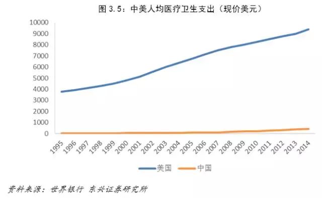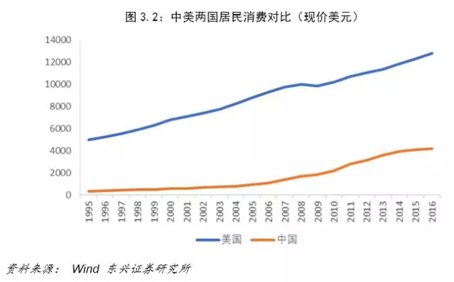 2017年世界企业500强中,中国上榜公司达到115家,其中中国大陆(含香港在内,不包括台湾地区)109家,美国有132家公司上榜。从企业所属行业结构看,中国的上榜企业主要集中在金融业、能源、炼油、采矿公司和房地产行业,而美国企业的行业分布更为多元,除了金融、能源类企业,电子、通信、装备制造等行业均有企业上榜。2017年中国企业500强实现营业收入64.0万亿元,约合9.63万亿美元(按照世界500强核算汇率6.6433进行折算,下同);美国企业500强总营业收入达12.06万亿美元。总体来看,在大型公司这一企业群体的比较中,中国企业500强的营业收入为美国企业500强的79.85%,仍有较大追赶空间。![]() 对比两国500强前10名可以发现,从营业收入来看,8家美国企业的营业收入明显高于同位次中国企业。从行业结构来看,中国500强前10位主要为能源、金融类企业,结构较为单一;美国500强前10位行业范围更广,相对更具备创新潜力。此外,中国企业500强中,国有及国有控股企业数量占比为54.8%,营业收入占比为71.83%,资产占比为86.19%,国有经济持续占据主导地位,民间活力有待进一步释放。 3.1 人均GNI 人均GNI是衡量一个国家居民人均收入水平的重要指标。从人均GNI来看,虽然中国自2006年以来人均GNI迎来一波稳定高速的增长,但在人均收入绝对值方面依然远远落后于美国。基于购买力平价,截至2016年,美国人均GNI水平为58030美元,而中国仅仅有15500美元,美国人均收入是中国3.74倍。 3.2 居民消费水平 居民消费水平可直观反映各国居民的生活水平。从现有数据分析来看,二十年来美国的个人消费支出基本保持直线上升的态势,已从1995年的4.98万亿美元跃升至2016年的12.82万亿。而中国的个人消费支出起点水平低,1995年的消费支出总额仅有0.34万亿,不及当年美国个人消费的十分之一;2016年消费支出总额为4.22万亿,但不及美国消费总额的三分之一。 从人均居民最终消费支出来看,根据世界银行的统计,按照2010年不变价美元计算,1990年以来,美国的人均居民最终消费支出从23100.42美元上升至2015年的35525.67美元,而中国仅从1990年的205.80美元上升至2015年的2401.70美元,两国的绝对差距扩大。综上所述,中美两国居民消费水平的差距十分明显。 3.3 人均医疗卫生支出 人均医疗卫生支出可以用来衡量一国居民的医疗保障水平。从世界银行的数据来看,中国人均医疗卫生支出远落后于美国,2014年为419美元,美国的人均医疗卫生支出稳步上升,2014年美国人均医疗卫生支出达到9402.5美元,是中国的22.4倍,差距十分明显。