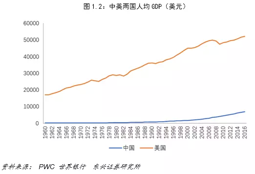 ![]() 1. 综合国力 1.1 经济规模 从GDP总量来看,根据世界银行公布的数据,按现价美元计算,2016年中国的GDP为11.20万亿,居世界第二,美国为18.57万亿,尚有7.37万亿的差距,我们预测中国的经济总量超过美国仍需十年以上的时间。 1.2 经济发展水平(人均GDP) 人均GDP是衡量国家经济发展水平最常用的单一指标。根据世界银行数据,2016年中美两国的人均GDP(2010年不变价)分别为6895美元和52195美元,美国的人均GDP为中国的7.6倍。根据我们的预测2027年中国人均GDP约为13000美元,初步达到发达国家(高收入国家)的下限,但是距离发达国家4万美元的平均水平还有较大差距。 1987年10月党的十三大提出中国经济建设分三步走的总体战略部署:第一步目标,1981年到1990年实现国民生产总值比1980年翻一番,解决人民的温饱问题;第二步目标,1991年到二十世纪末国民生产总值再增长一倍,人民生活达到小康水平;第三步目标,到二十一世纪中叶人民生活比较富裕,基本实现现代化,人均国民生产总值达到中等发达国家水平,人民过上比较富裕的生活。前两步目标基本实现,而对于第三步目标十九大有新的表述。 在党的十九大上,习近平总书记提出了未来三十年的发展蓝图:从2020年到2035年,“再奋斗十五年,基本实现社会主义现代化”;从2035年到本世纪中叶,“再奋斗十五年,把我国建成富强民主文明和谐美丽的社会主义现代化强国”。从世界发展史来看,人均GDP从8千美元到4万美元,美国用时约26年,日本用时约31年,中国需要多久? 根据普华永道的测算,2050年中国GDP为49.85万亿美元,美国为34.10万亿美元。基于世行估计的人口数据估算人均GDP,中国在2050年的人均GDP为3.73万美元,美国为8.78万美元,差距仍然巨大。 ![]() 全要素生产率用来衡量生产的效率,产出增长率超出要素投入增长率的部分为全要素生产率,一般有三个来源:一是技术进步;二是规模经济;三是效率改进。从CTFP(按目前的购买力平价计算的TFP)来看,新世纪以来,我国的全要素生产率增长较快,但与美国差距仍然较大,不到美国全要素生产率水平的一半。 劳动生产率由一定时期内劳动者的劳动成果和其相适应的劳动消耗量的比值计算得到,可以用单位时间内所生产的产品的数量或价值来表示。根据世界劳工组织的测算,21世纪以来,中国的劳动生产率从2000年的2023美元跃升至目前的8253美元,而美国的劳动增长率2000年就已达到81316美元,2017年已突破十万元大关,为101101美元。中国虽然增长显著,但目前的劳动生产率尚不足美国的10%,生产力有待进一步解放。 1.4 产业结构高级化水平 产业结构高度化也称产业结构高级化。指一国经济发展重点或产业结构重心由第一产业向第二产业和第三产业逐次转移的过程,标志着一国经济发展水平的高低和发展阶段、方向。从劳动力分布来看,近10年来中国的第一产业就业人数平均占比为35.54%,第二产业为28.48%,第三产业为35.98%;美国的第一产业就业人数平均占比为1.53%,第二产业为18.95%,第三产业为79.52%。中国进步虽快,但差距依然明显。 从三次产业产出占比来看,近10年来,中国的第一产业产出占GDP的比重为9.65%,第二产业占比为45.34%,第三产业占比为45.01%;美国的第一产业产出占GDP的比重为1.65%,第二产业占比为29.38%,第三产业占比为68.97%。中国的二三产业的产出占比接近,与美国相比,第三产业仍有很大的提升空间。 1.5 人类发展指数 个人是经济活动的直接参与者,是现代社会的最小组成单元。一国居民的个人发展空间和生活质量也是综合国力的集中体现。人类发展指数(HDI)是联合国开发计划署于1990年创立的指标,用来衡量联合国各成员国经济社会发展水平,可全面反映各国居民的生活质量,在国际社会广泛应用。该指数由预期寿命指数(LEI)、教育指数(EI)和收入指数(II)三项基本指标构成,是三项指标的几何平均数。根据其联合国开发计划署的相关资料, 2015年,在接受排名的188个国家中,中国的HDI为0.738,居第90位;美国的HDI为0.920,居第10位,说明两国居民的个人发展空间和生活质量仍有较大差别。从时间趋势来看,中国的HDI水平从1990年的0.499上升到2015年的0.738,涨幅达47.9%;美国的HDI水平比较平稳,从0.860(1990年)缓慢增加至0.920(2015年)。虽然中国的HDI在稳步上升,但其数量上与美国尚有差距。 2. 营商环境与企业实力 2.1 营商环境 企业是经济活动中最重要的主体,是社会财富的主要创造者。营商环境在企业成长过程中扮演的角色举足轻重。国务院总理李克强曾指出,营商环境就是生产力。良好的经营环境对激发企业活力,促进经济持续增长起到十分重要的作用。从营商环境来看,根据世界银行近五年来发布的《全球营商环境报告》,中国的营商环境质量虽逐年改善,全球综合排名稳步上升,但与美国的相比仍有很大进步空间。近五年的数据显示,在约200个被调查国家中,中国已从96名(2014年)上升至78名,进步幅度明显,但美国一直稳居前十名。 从具体指标来看,创办企业所需时间是指完成合法经营企业所需程序的历日数。2003年以来,中国创办企业所需的平均时长为37.7天,而美国仅为5.6天。同样条件下,中国创办企业的时间成本是美国的6.7倍。通常用企业注册成本占人均国民总收入的百分比来衡量企业注册的成本,2003年以来,中国企业注册成本占人均国民总收入的百分比的平均水平为6.62%,而美国仅为0.99%。虽然近年来中国企业注册成本