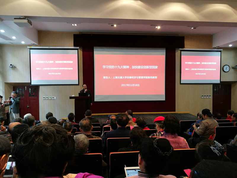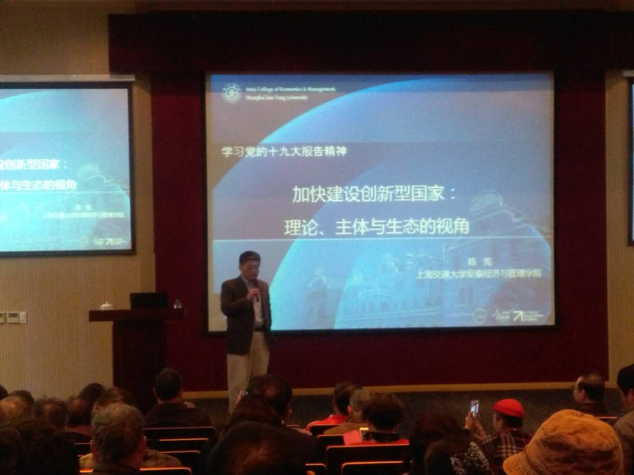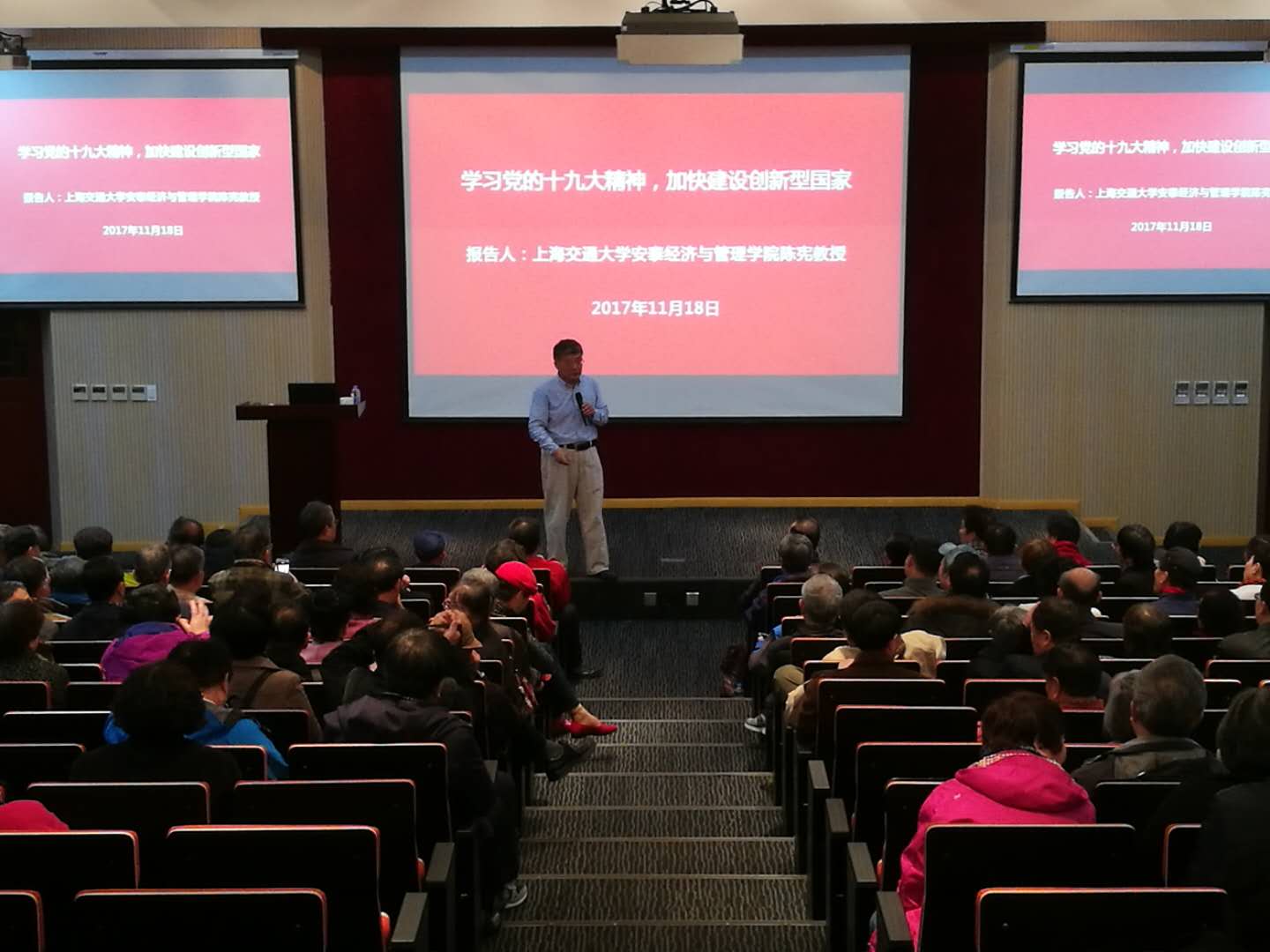 下午1时半,在交大新上院教学楼,由原江西知青、上海交大安泰经济与管理学院院长陈宪教授,做了题为《学习党的十九大精神,加快建设创新型国家》的报告。报告会由研究会会长阮显忠主持。