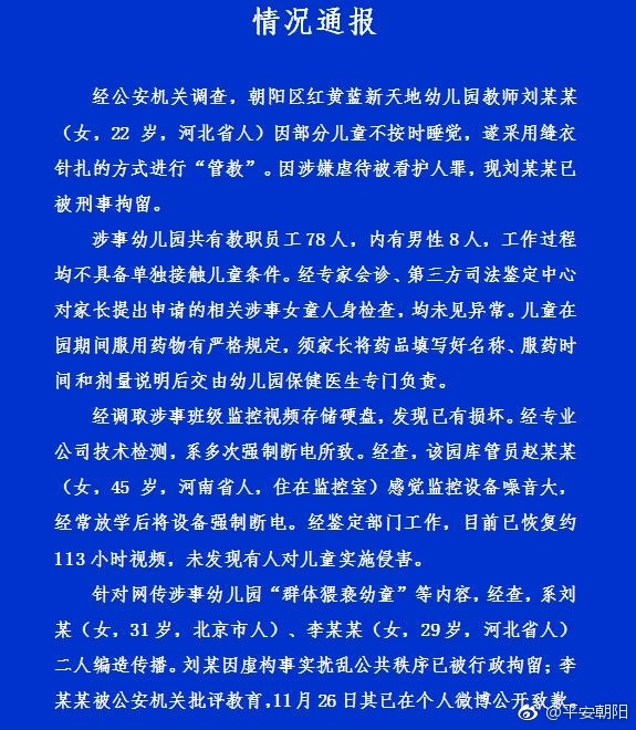 11月28日晚,北京市公安局朝阳分局官方微博@平安朝阳通报红黄蓝新天地幼儿园事件调查结果。以下为通报内容: 经公安机关调查,朝阳区红黄蓝新天地幼儿园教师刘某某(女,22岁,河北省人)因部分儿童不按时睡觉,遂采用缝衣针扎的方式进行“管教”。因涉嫌虐待被看护人罪,现刘某某已被刑事拘留。 涉事幼儿园共有教职员工78人,内有男性8人,工作过程均不具备单独接触儿童条件。经专家会诊、第三方司法鉴定中心对家长提出申请的相关涉事女童人身检查,均未见异常。儿童在园期间服用药物有严格规定。须家长将药品填写好名称、服药时间和剂量说明后交由幼儿园保健医生专门负责。 经调取涉事班级监控视频存储硬盘,发现已有损坏。经专业公司技术检测,系多次强制断电所致。经查,该园库管员赵某某(女,45岁,河南省人,住在监控室)感觉监控设备噪音大,经常放学后将设备强制断电。经鉴定部门工作,目前已恢复约113小时视频,未发现有人对儿童实施侵害。