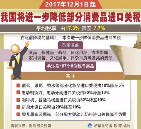 12月起,这些新规将影响你我生活!快看看吧! 12月1日起进口关税再下调,这些货品零税率 财政部近日发布消息,从12月1日起,我国将进一步降低部分消费品进口关税,平均税率由17.3%降至7.7%。 唇膏、眼影、香水等化妆品关税由10%降至5%,咖啡机、智能马桶盖由32%降至10%,矿泉水由20%降至10%…… 其中,力度最大的是婴儿尿布及尿裤,以及部分配方婴幼儿奶粉,进口关税均降为零。 不难看出,此次降税产品的一大特点是与人民生活息息相关,覆盖面广、降幅明显,涵盖食品、保健品、药品、日化用品、服装鞋帽、家用设备、文化娱乐、日杂百货等消费品,共涉及187项商品,平均税率由17.3%降至7.7%。 其实2015年以来,我国已连续3次降低消费品进口关税,分别是2015年6月、2016年1月和2017年1月,主要选取了我国居民在境外购买意愿较强、关税税率较高消费品。 ![]() 到2017年11月,我国已对152个税号的消费品实施了暂定税率,平均降幅为50%,涉及一般贸易年进口额109亿美元。 社科院财经战略研究院研究员杨志勇说,此次降低消费品进口关税,一方面有利于扩大国内有效供给,更好满足人民消费需求,另一方面有利于进口产品同国内产品开展竞争,引导我国供给体系转型升级,更好地适应消费需求变化。 “从过去的高新产品到如今的消费品,降低进口关税已经成为一种趋势。”中国贸促会研究院国际贸易研究部主任赵萍说,这是在高水平对外开放格局下我国外贸思路转变的表现,有助于推动进出口贸易平衡。同时也能让国际市场更多分享中国经济发展带来的红利。 进口关税的调整意味着今后消费者在国内即可以更低的价格买到心仪的进口产品。 这一政策的直接影响就是有助于将大量外流的消费留在国内。世界旅游组织数据显示,2016年中国游客境外旅游消费达到2610亿美元,同比增长12%,中国游客是世界上境外旅游消费最多的游客。 国内外产品的差价成为消费外流的主要原因。专家指出,我国居民每年在境外的消费若有三分之一或三分之二回流,就能拉动消费增长一个百分点。消费品进口关税降低力度加大,有助于进一步扩大国内需求。 国家食药监总局:药品注册申请调整为集中受理 经国家食品药品监督管理总局研究决定,自2017年12月1日起,将现由省级食品药品监督管理部门受理、国家食品药品监督管理总局审评审批的药品注册申请,调整为国家食品药品监督管理总局集中受理。 本次调整后,国家食品药品监督管理总局集中受理业务将包括新药临床试验申请、新药生产(含新药证书)申请、仿制药申请以及国家食品药品监督管理总局审批的补充申请等。 调整规定,2017年12月1日前,省级食品药品监督管理部门已签收资料但尚未受理或已受理但药物临床试验现场核查、研制现场核查、生产现场检查及抽样等工作尚未完成的注册申请,仍由省级食品药品监督管理部门组织完成相关工作。此外,由省级食品药品监督管理部门审批、备案的药品注册申请不受影响,仍由省级食品药品监督管理部门受理。 非居民企业所得税源泉 扣缴取消合同备案和税款清算 据国家税务总局网站消息,日前,国家税务总局发布《关于非居民企业所得税源泉扣缴有关问题的公告》。根据《公告》内容,税务部门将减轻纳税人及扣缴义务人负担,简化计算操作,便利扣缴义务人履行义务。其中,在减少办税负担方面,取消合同备案和取消税款清算,简并需报送的报表资料。 根据《公告》,《国家税务总局关于印发〈非居民企业所得税源泉扣缴管理暂行办法〉的通知》(国税发〔2009〕3号)(下称《通知》)自2017年12月1日起废止。该通知第五条规定,扣缴义务人每次与非居民企业签订涉及源泉扣缴事项的业务合同时,应当自签订合同(包括修改、补充、延期合同)之日起30日内,向其主管税务机关报送《扣缴企业所得税合同备案登记表》、合同复印件及相关资料。该项规定被废止后,除自主选择在申报和解缴应扣税款前报送有关申报资料的外,扣缴义务人不再需要办理该项合同备案手续。 《通知》第五条规定,对多次付款的合同项目,扣缴义务人应当在履行合同最后一次付款前15日内,向主管税务机关报送合同全部付款明细,前期扣缴表和完税凭证等资料,办理扣缴税款清算手续。公告废止该项规定,扣缴义务人不再需要办理该项税款清算手续。 鉴于《中华人民共和国扣缴企业所得税报告表》栏目内容已经包含相关合同信息,为避免重复填报信息,公告废止了《扣缴企业所得税合同备案登记表》。除特定情形外,不再普遍要求报送合同资料。特定情形限于《国家税务总局 国家外汇管理局关于服务贸易等项目对外支付税务备案有关问题的公告》(国家税务总局 国家外汇管理局公告2013年第40号)第二条和本公告第十一条规定需要提供相关合同资料的情形。 《铁路线路设计规范》和《铁路车站及枢纽设计规范》实施 国家铁路局发布《铁路线路设计规范》(TB 10098-2017)和《铁路车站及枢纽设计规范》(TB 10099-2017)行业标准(以下简称“线规”和“站规”),自2017年12月1日起实施。 铁路线路设计在铁路工程设计中起着主导和统筹各专业设计的总体作用;铁路车站及枢纽设计系统性强,且与各专业联系紧密。两项规范是铁路设计中最基础、最重要的技术标准。 本次标准修订认真贯彻国家“创新、协调、绿色、开放、共享”的发展理念,