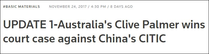 路透社报道截图 一、专利赔偿案 据微信公号“矿业汇”11月30日报道,2015年,Mineralogy公司起诉中信股份,索赔100亿澳元(约合人民币500亿元),声称中信正从双方在西澳大利亚合资的中澳铁矿(Sino Iron)项目出口铁矿石,却没有按约定水平支付特许权使用费。 此前中信就磁铁矿开采权向Mineralogy公司支付了4.15亿美元,并就开采原矿向其支付专利费A,但Mineralogy坚持中信还应为生产的精矿粉支付专利费B。 双方一直争执不下,西澳高等法院今年六月曾对该诉讼进行两周的聆讯,但是没有定论。