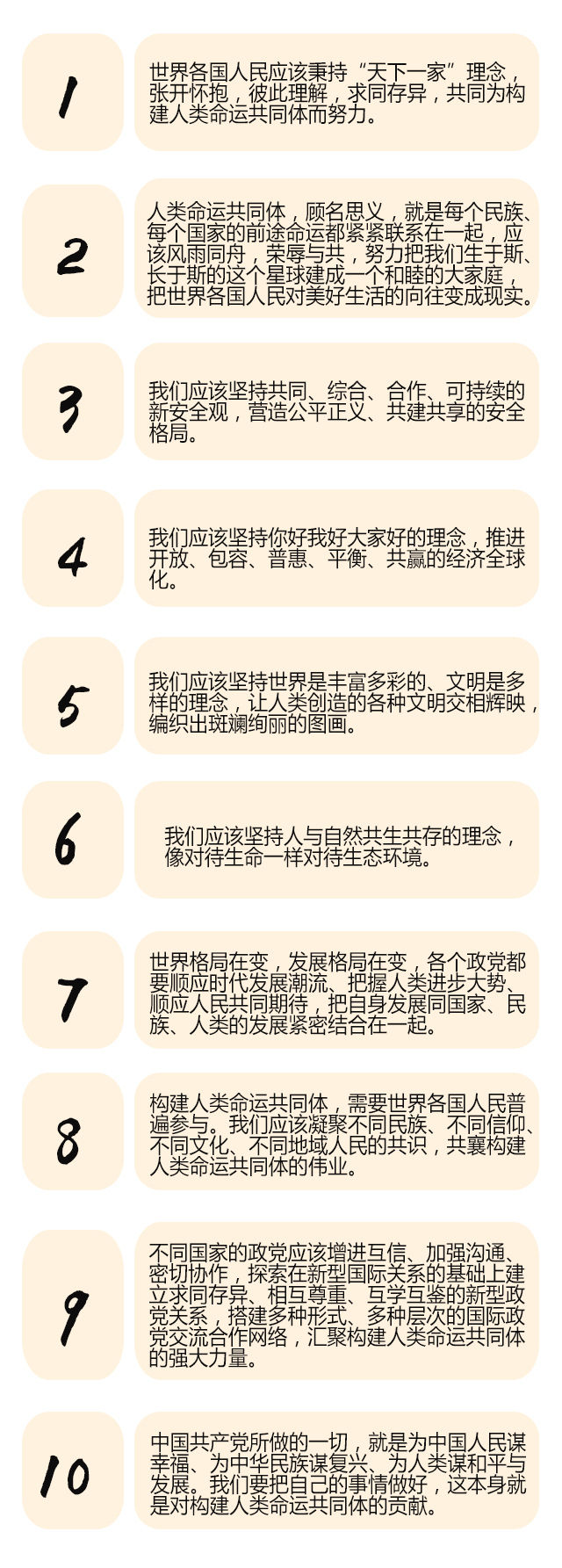 构建人类命运共同体,是习近平总书记向世界贡献的重要理念,我们予以支持。全世界的人民,都应该共享和平与繁荣,去创造更美好的生活。我们必须把这个理念带回国,带给我们的人民。