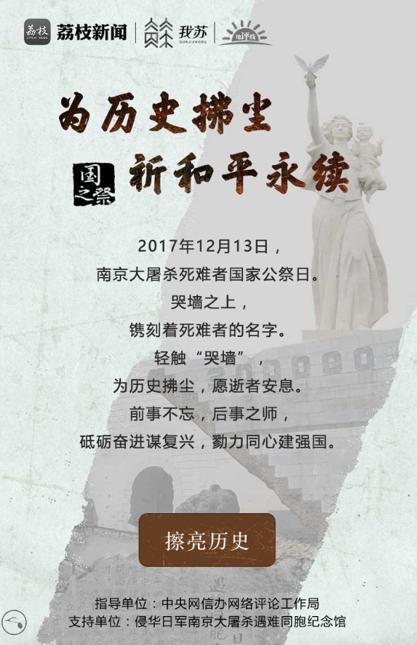 为了永不忘却的纪念,2017年国家公祭日来临之际,荔枝新闻和我苏客户端推出特别策划“为历史拂尘,祈和平永续”互动。愿擦亮的名字守护历史的真相,愿和平的祈愿温暖寒冬的殇城。 的确,一切苦难皆有名字,每个名字都是一部历史。哭墙是情感的表达、个体的史书。它无声,可那嵌进时间的笔画里是30万个体的愤怒、呼喊和哀叫;它无泪,可那饱蘸生命的笔墨里是30万个体的血泪与凋萎。 进入“为历史拂尘,祈和平永续”互动页面后,刻有万余遇难者名字的哭墙会持续滚动。