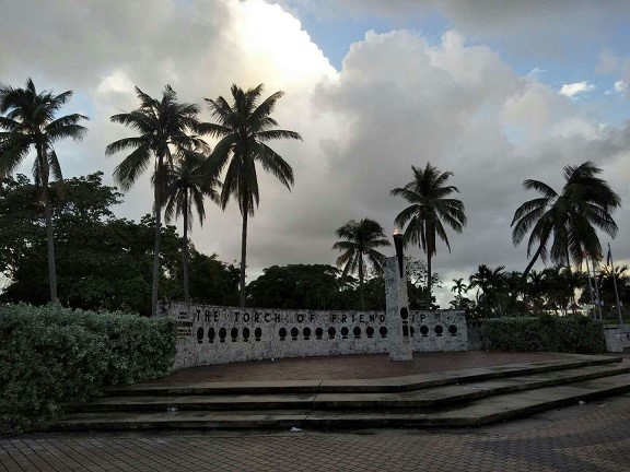 随后,我们来到了海湾公园,游览“世界游艇之都”的美景,登高到楼台上,看见海湾里众多游艇停泊着,海鸟盘旋着,临海的高楼大厦远近交相映辉,一长溜餐厅散发出诱人的香味。 ![]() 走出公园外侧,见到一堵造型独特的灰白色矮墙,圆窟窿里燃烧着点点火焰,前面有一个标志性的火炬,据称是为纪念美国总统肯尼迪竖立的“友谊的火炬”。