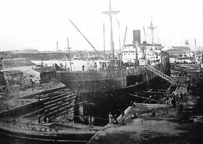 ▲1918年,江南造船所为美方建造“官府”“天国”“东方”“国泰”四艘运输舰,这是中国首次建造万吨级出口船。图为江南造船所建造“官府”号的情景。
