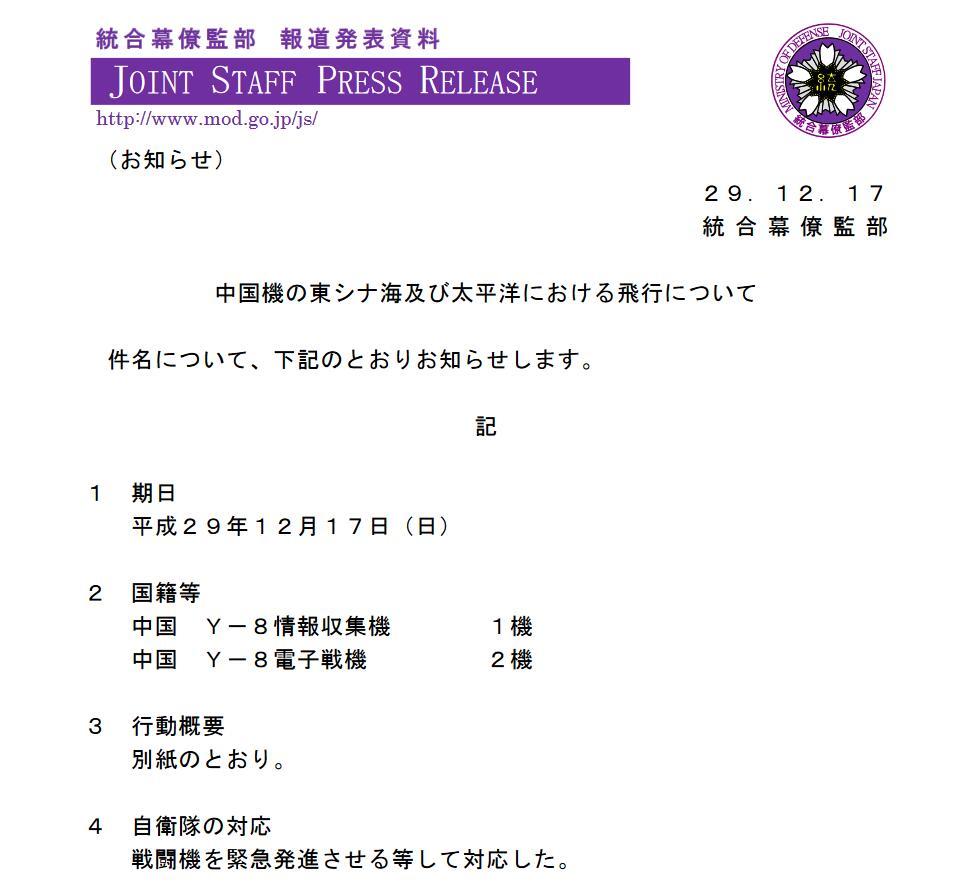 日本防卫省统合幕僚监部发布的解放军战机飞行情况简报