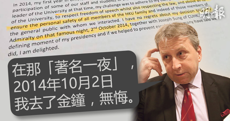 马斐森发公开信称无悔去“占领区”(图源:港媒) 香港大学校长马斐森(Peter William Mathieson)即将离任,今(21)日向港大师生和校友发电邮,细数自己在任时的成就,提到“占中”时称没后悔去“占领区”在望港大学生。据了解,马斐森任内,港大爆出多场风波,港人对他处理该校“占中”学生及“占中”发起人等措施也多有不满。 据香港《明报》消息,马斐森每逢年尾都会发放年终信息,今年的信件长达7页多,主要述说上任以来落实措施和成就,亦有提及非法“占中”行为。据了解,2014年正值马斐森上任和非法“占中”开始。马斐森于信中指出,当时因有些港大教职员和学生参与“占中”,令大学处于争议中心,只好以“尊重言论自由同时须尊重法律,和确保自己和大众的安全”为原则应对。马斐森当年10月2日,到金钟“占领区”探望学生。马斐森当时上任只有数月,但他称无悔此决定,形容是任校长的“关键时刻”(defining moment),也有很多人指,此举可阻止当时行动升级。 据港媒港早前报道,香港大学今年2月公布,现任校长马斐森以个人理由辞职,他将于2018年1月离任,离任后将任职英国爱丁堡大学校长。据了解,马斐森是英国著名的医学学者、临床医学专家,2014年4月,获聘出任香港大学校长。作为港大第15任校长,马斐森2014年4月履新,合约期为5年,即至2019年3月约满。由于提出辞职,他将于2018年1月正式离任。