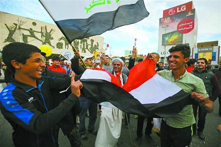 12月10日,在伊拉克巴格达解放广场,人们集会庆祝击败“伊斯兰国”。