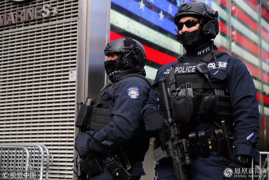当地时间2017年12月29日,美国纽约,迎新年庆祝活动前时报广场安保加强,反恐局警察荷枪实弹站岗。图片作者:ANDREW KELLY/视觉中国