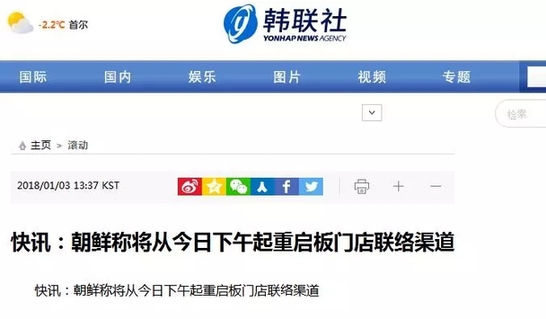 英国路透社1月3日消息,朝鲜方面称将在格林威治时间6点30分(北京时间14:30)分与韩国方面开通边境热线。韩联社3日报道称,朝鲜称将从今日下午起重启板门店联络渠道,朝鲜称将与韩方讨论派团参奥事宜。 另据央视新闻 朝鲜称将从今下午起重启板门店联络渠道 与韩方讨论派团参奥事宜 当地时间3日下午,韩国媒体援引朝鲜中央电视台消息报道称,朝鲜宣布将于当天(3日)下午重启位于板门店的朝韩联络渠道,商讨朝鲜派团参与平昌冬奥会等事宜。 朝鲜“祖国和平统一委员会”委员长李善权当天出现在朝鲜中央电视台报道中作出上述表态。李善权表示,朝方将会和韩方就平昌冬奥会等问题进行密切沟通。 2016年2月,在时任韩国总统朴槿惠主导下,被称为朝韩关系“最后堡垒”的开城工业园被关停,朝韩间交流合作被完全切断,位于板门店的朝韩沟通渠道也随之陷入停摆状态。(央视记者唐鑫) 早前报道: 新华社快讯:韩国统一部长官赵明均2日向朝鲜提议9日在板门店举行韩朝高级别会谈。 罕见友好互动!文在寅回话金正恩:欢迎朝鲜代表团参加冬奥