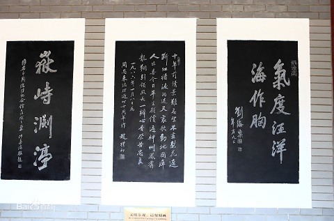 在周恩来故居和纪念馆,珍藏着由著名书画家、美术教育家刘海粟先生题写的两件墨宝。周恩来纪念馆的是“气度汪洋海作胸”,故居的作品是在周恩来逝世十周年(即1986年),刘海粟大师特意为周恩来故居题写的七言律诗:“不朽声巍震九垓,绝伦四海一人才。立身严正留公论,谋国忠勤悴杰魁。悲痛化为群众力,德功无愧万方推。英灵妥矣昭遗爱,松柏常青望继来。”这两幅行揩,充分体现了刘海粟对周恩来深深怀念和无限景仰;从艺术角度看,法度俱备,神完气足,显示了刘海粟先生深厚的艺术功力和温和醇厚、化博大于平静之中的审美取向,看其雍容的气度、似乎书者已将全部艺术人生的风云变幻凝于胸中,化入笔底,让我们看到了他平静的外表下宽阔如海的胸怀,这两幅作品具有很高的艺术价值和观赏价值。