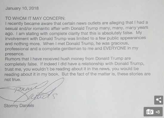 据英国《每日邮报》报道,据说,在2016年大选前一个月,特朗普的律师科恩向38岁的克里福德支付了封口费。作为保密协议的一部分,她同意不公开2006年7月高尔夫名人赛期间在太浩湖(LakeTahoe)酒店的事情。本周美国《华尔街日报》的一份报告披露了此事,但特朗普的律师强烈否认曾经发生过性关系。 ![]()