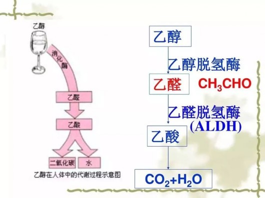 酒精(乙醇)进入体内后,由乙醇脱氢酶代谢为乙醛,然后再由乙醛脱氢酶代谢为乙酸。一头一尾的乙醇和乙酸都相对安全,但中间的乙醛很危险。乙醛能直接结合DNA,诱发基因突变,所以世界卫生组织把乙醛列为一级致癌物!