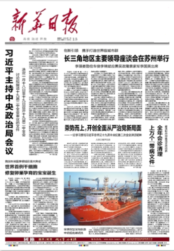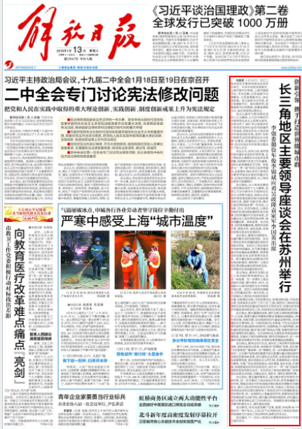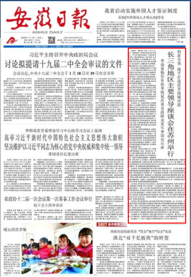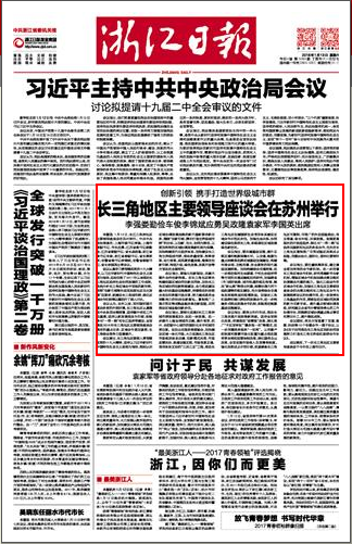 解放日报、浙江日报、新华日报、安徽日报2018年1月13日头版 创新引领携手打造世界级城市群 长三角地区主要领导座谈会在苏州举行 李强娄勤俭车俊李锦斌应勇吴政隆袁家军李国英出席 1月12日,长江三角洲地区主要领导座谈会在苏州举行。中共中央政治局委员、上海市委书记李强,上海市委副书记、市长应勇;江苏省委书记娄勤俭,江苏省委副书记、省长吴政隆; 浙江省委书记车俊,浙江省委副书记、省长袁家军;安徽省委书记李锦斌,安徽省委副书记、省长李国英出席会议。 会议认真学习贯彻落实党的十九大精神,以习近平新时代中国特色社会主义思想为指导,总结交流了2017年以来推进长三角地区经济社会协同发展的工作成效,系统分析长三角区域合作面临的新形势,按照“创新引领率先实现东部地区优化发展”总要求,就建设长三角城市群、深化区域合作机制等议题进行了深入讨论。 会议认为,去年以来,面对国际国内复杂多变的外部环境,长三角地区认真落实中央各项决策部署,坚持稳中求进工作总基调,坚持以新发展理念为引领,积极参与“一带一路”和长江经济带建设,全面落实2016年长三角地区主要领导座谈会确定的重点任务,区域合作更加紧密,长三角综合竞争力显著提升。 会议提出,长三角地区要深入贯彻落实党的十九大精神,坚持以习近平新时代中国特色社会主义思想为指导,深刻认识区域协调发展战略的新内涵新要求新任务,围绕“创新引领,携手打造世界级城市群”的目标,以创新、优化、协同为路径,以更加有效的区域协调发展新机制为保障,加快构建现代化经济体系,加快建设长三角世界级城市群,推动质量变革、效率变革、动力变革,实现高质量发展,继续在创新引领、转型升级、绿色发展、改革开放等方面走在全国前列。 会议指出,要强化创新驱动,共建内聚外合的创新网络。在长三角地区率先构建我国区域协同创新共同体,加快长三角区域协同创新网络建设,合力推进建设重大科技基础设施集群,持续推进科技联合攻关和资源开放共享,努力建成具有全球影响力的科技创新高地。复制推广上海自贸区等成熟金融改革创新经验,共同推动区域金融创新步伐。 会议指出,要深化实施《长江三角洲城市群发展规划》,促进一体发展。进一步提升上海全球城市功能,提升南京、杭州、合肥副中心城市的国际化水平和城市首位度。促进公共服务深度融合,加快建设区域一体化市场,大力实施长三角地区市场规则体系共建、创新模式共推、市场监管共治、流通设施互联、市场信息互通、信用体系互动的“三共三互”工程,推进长三角地区创建国家社会信用体系建设区域合作示范区步伐。加强生态共保,协同建设绿色美丽长三角,积极谋划区域发展绿色新空间。 会议指出,要共建基础设施,提升互联互通和能源保障水平。以交通、能源为重点统筹推进跨区域基础设施建设,构建布局合理、功能完善、安全高效的现代基础设施网络。加快构建综合交通网络,进一步推进淮河生态廊道、宁杭生态经济带等方面的交通运输规划和研究,加强跨省(市)城际铁路、城市轨道的规划衔接,解决“断头路”等突出问题,统筹协调内河干线航道等的规划建设,充分发挥综合交通体系网络效益和规模效益。加强长三角机场群和港口群协同发展合作,进一步构建多式联运发展合作机制,积极推进能源基础设施建设。