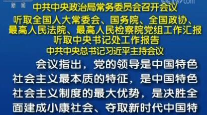 中共中央政治局常务委员会1月15日全天召开会议,听取全国人大常委会、国务院、全国政协、最高人民法院、最高人民检察院党组工作汇报,听取中央书记处工作报告。中共中央总书记习近平主持会议并发表重要讲话。 会议指出,党的领导是中国特色社会主义最本质的特征,是中国特色社会主义制度的最大优势,是决胜全面建成小康社会、夺取新时代中国特色社会主义伟大胜利的根本保证。事在四方,要在中央。坚持党的领导首先是坚持党中央集中统一领导。全党要牢固树立政治意识、大局意识、核心意识、看齐意识,把维护党中央权威和集中统一领导作为最高政治原则和根本政治规矩来执行。 会议强调,党的十八大以来,中央政治局常委会、中央政治局连续3年听取全国人大常委会、国务院、全国政协、最高人民法院、最高人民检察院党组工作汇报和中央书记处工作报告,并将这项工作写入《关于新形势下党内政治生活的若干准则》和《中共中央政治局关于加强和维护党中央集中统一领导的若干规定》。实践证明,这是坚持党中央权威和集中统一领导的重要制度安排,十分必要、很有意义,必须坚持下去。 会议认为,过去的一年,全国人大常委会、国务院、全国政协、最高人民法院、最高人民检察院党组自觉坚持党中央集中统一领导,认真贯彻党中央决策部署,围绕党和国家工作全局履职尽责,保证了党中央重大决策部署贯彻落实,推动各项工作取得了新进展新成效,为实现党和国家事业新发展作出积极贡献。同时,充分发挥党组的领导作用,严格贯彻民主集中制,自觉履行管党治党主体责任,加强党组自身建设,坚持不懈正风肃纪,在全面从严治党上发挥了表率作用。 会议认为,过去的一年,中央书记处认真贯彻党中央决策部署,协助党中央推进全面从严治党部署要求贯彻落实,指导做好群团工作,推动党内法规完善实施,配合办好一系列重要会议和重大纪念活动,各方面工作取得了新成绩。 会议强调,今年是贯彻党的十九大精神的开局之年,是改革开放40周年,是决胜全面建成小康社会、实施“十三五”规划承上启下的关键一年。全国人大常委会、国务院、全国政协、最高人民法院、最高人民检察院党组要增强“四个意识”,自觉同以习近平同志为核心的党中央保持高度一致,认真学习贯彻习近平新时代中国特色社会主义思想和党的十九大精神,把党的政治建设摆在首位,坚持正确的政治立场、政治方向、政治原则、政治道路,确保令行禁止、政令畅通。要坚持稳中求进工作总基调,大兴调查研究之风,提高决策和执行的科学性和有效性,以锐意进取、奋发有为的精神状态推动党中央大政方针和决策部署落地生根。要带头贯彻党章和《中共中央政治局关于加强和维护党中央集中统一领导的若干规定》,带头执行中央八项规定及其实施细则,严守政治纪律和政治规矩,抓好党组自身建设,推动全面从严治党向纵深发展。