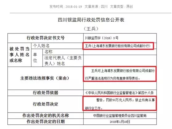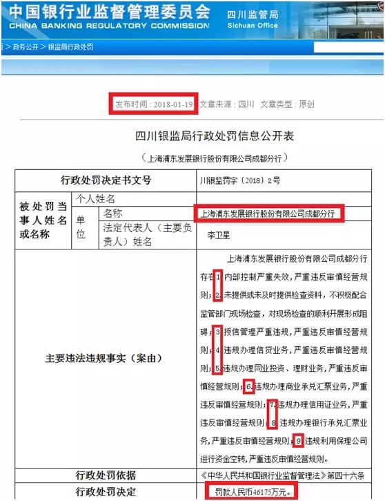 ![]() 该银行向1493个空壳企业授信775亿元,换取相关企业出资承担浦发银行成都分行不良贷款。 中国银监会四川监管局对该银行的处罚结果中详细列明了9条违法违规内容。 9条违法违规内容逐个看 从中国银监会四川监管局的官网处罚公告中可以看出,被处罚单位为上海浦东发展银行股份有限公司成都分行,被处罚金额为4.6175亿元。 具体处罚公告中对应的主要违法违规事实有以下9条“” 1、内部控制严重失效,严重违反审慎经营规则。 2、未提供或未及时提供检查资料,不积极配合监管部门现场检查,对现场检查的顺利开展形成阻碍。 3、授信管理严重违规,严重违反审慎经营规则。 4、违规办理信贷业务,严重违反审慎经营规则。 5、违规办理同业投资、理财业务,严重违反审慎经营规则。 6、违规办理商业承兑汇票业务,严重违反审慎经营规则。 7、违规办理信用证业务,严重违反审慎经营规则。 8、违规办理银行承兑汇票业务,严重违反审慎经营规则。 9、违规利用保理公司进行资金空转,严重违反审慎经营规则。 这9条中所涉及的内容很广泛,主要是发放贷款方面的问题,还有一些同业投资、理财等业务。 问责处罚198人 在银监会的问题通报中,披露了更多的细节。 银监会在现场检查中发现,浦发银行成都分行存在重大违规问题,立即要求浦发银行总行派出工作组对成都分行相关问题进行全面核查。 通过监管检查和按照监管要求进行的内部核查发现,浦发银行成都分行为掩盖不良贷款,通过编造虚假用途、分拆授信、越权审批等手法,违规办理信贷、同业、理财、信用证和保理等业务,向1493个空壳企业授信775亿元,换取相关企业出资承担浦发银行成都分行不良贷款。 银监会表示,这是一起浦发银行成都分行主导的有组织的造假案件,涉案金额巨大,手段隐蔽,性质恶劣,教训深刻。 ![]() 此案暴露出浦发银行成都分行存在诸多问题:一是内控严重失效。该分行多年来采用违规手段发放贷款,银行内控体系未能及时发现并纠正。二是片面追求业务规模的超高速发展。该分行采取弄虚作假、炮制业绩的不当手段,粉饰报表、虚增利润,过度追求分行业绩考核在总行的排名。三是合规意识淡薄。为达到绕开总行授权限制、规避监管的目的,该分行化整为零,批量造假,以表面形式的合规掩盖重大违规。此外,该案也反映出浦发银行总行对分行长期不良贷款为零等异常情况失察、考核激励机制不当、轮岗制度执行不力、对监管部门提示的风险重视不够等问题。 这一案发后,银监会高度重视,多次召开党委会议和专题会议研究部署查处工作,并成立专责小组,与上海市委市政府、四川省委省政府建立工作协调机制,通过采取强有力的措施推进风险处置和整改问责工作。在银监会统筹指导下,四川银监局制定实施“特别监管措施”,实行“派驻式监管”,开展多项专项排查治理,积极推动合规整改工作。四川省委省政府和上海市委市政府也高度重视,各方互相协作配合,共同推进风险处置工作,全力维护社会稳定和地方金融安全。 浦发银行根据监管要求,在摸清风险底数的基础上,对违规贷款“拉直还原”做实债权债务关系,举全行之力采取多项措施处置化解风险,并按照党规党纪、政纪和内部规章,给予成都分行原行长开除、2位原副行长分别降级和记大过处分,对195名分行中层及以下责任人员内部问责。截至2017年9月末,浦发银行成都分行已基本完成违规业务的整改,目前该分行班子队伍稳定,总体经营平稳正常。 多名银行人士被处罚 四川银监局除了依法对浦发银行成都分行罚款4.62亿元之外,还对涉案个人开出了多张罚单。 ![]() 据了解,王兵曾任浦发银行成都分行行长,四川银监局的处罚理由为:王兵对浦发银行成都分行严重违法违规行为负有直接领导责任。具体处罚内容包括两条,1是警告,罚款50万元人民币;2是禁止终身从事银行业工作。 此外,四川银监局还对浦发银行成都分行2名原副行长、1名部门负责人和1名支行行长分别给予取消高级管理人员任职资格、警告及罚款。 银监会还表示,目前,相关涉案人员已被依法移交司法机关处理。银监会近日已依法对浦发银行总行负有责任的高管人员及其他责任人员启动立案调查和行政处罚工作。 此外,鉴于四川银监局对浦发银行成都分行相关风险线索等问题未全面深查,监管督导不力,对其监管评级失真,银监会党委责成四川银监局党委深刻反省,吸取教训,并对四川银监局原主要负责人和其他相关责任人进行了严肃问责,给予党纪政纪处分。 对于未来的工作,银监会表示,下一步将认真贯彻落实党的十九大、中央经济工作会议和全国金融工作会议精神,坚持“监管姓监”,勇于负责,敢于亮剑,进一步深化整治银行业市场乱象工作,打好防范化解重大金融风险攻坚战。 浦发银行去年曾否认成都分行被骗贷 2017年4月5日,一篇名为《浦发银行成都分行成“壳”公司温床,违规资金超1000亿元》的文章,在网络间流传。 该文章称,截至2016年11月末,浦发银行成都分行,向2010个非正常经营或虚假注册的“壳”公司授信1655笔,合计1600亿元。这些资金,最终由7大集团公司实际使用,截至目前已显现风险865亿元。 对此,浦发银行去年回应腾讯财经称,该行已关注到上述信息,“相关信息与事实不符”。该行同时表示,“近年来,受区域实体经济下行影响,我