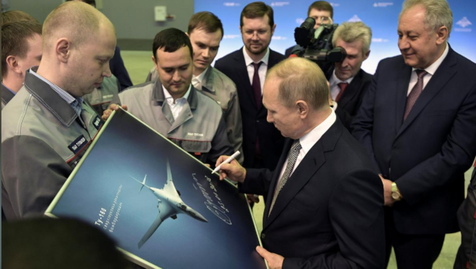 普京25日视察喀山飞机制造厂时,在图-160M2巨幅照片上签字。(今日俄罗斯电视台)