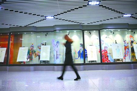 陕西南路地铁换乘通道内的京剧艺术展示窗。