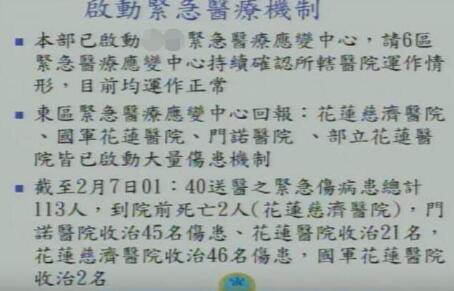 搜救人员现场图 另据海外网报道,花莲市目前统计灾情如下: 1、花莲国盛一街1号大楼倒塌。 2、国盛六街41号民宅倒塌。 3、七星大桥龟裂。 4、花莲大桥窿起。 5、花莲市华西路龟裂 6、统帅大饭店倒 7、前站阿官火锅大楼倒 8、美仑饭店倒斜 对此,消防署已立即成立灾害应变中心,特种搜救队、第1梯次嘉义市、第2梯次彰化县预做准备,另台北市、新北市(8车36人3犬)、桃园市、台中市(22人、2犬)、台南市、高雄市、新竹市消防局搜救队整备出勤。 同时,也调度国军C-1301架次至台中清泉岗及台北松山机场待命,以及空勤总队黑鹰直升机NA-703进行空勘,并通报“台国防部”(二战区314人)前往统帅饭店及商校街2号旅店前往救援。