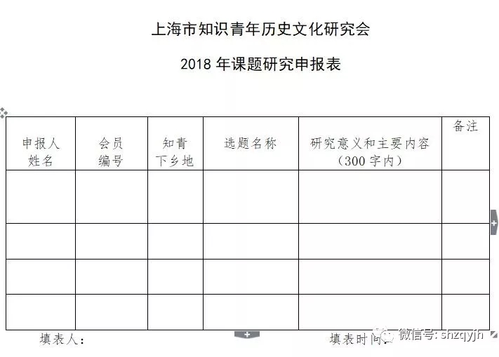 各位会员、各知青学术研究者: 2018年是贯彻党的十九大精神的开局之年,也是毛主席关于知识青年到农村接受贫下中农再教育指示发表50周年和我国实行改革开放40周年。为更好地学习贯彻党的十九大精神,纪念两个重大历史事件,深化新时代知青学术研究,现发布2018年重点研究课题和有关要求如下。 一、2018年重点研究课题 (一)关于知青上山下乡 1、开展知青上山下乡的动因; 2、知青下乡期间的基本情况和不同地区、类型知青状况的异同; 3、知青群体对农村和边疆的作用; 4、知青上山下乡运动结束的过程和原因; 5、知青上山下乡经历对知青人生发展的影响; 6、知青上山下乡运动的发展过程及其评价; (二)关于知青与改革开放 1、改革开放时期知青面临的挑战和机遇; 2、改革开放与知青命运变化; 3、知青群体在改革开放中的作用; (三)关于新时代中的知青 1、新时代知青精神文化需求; 2、新时代知青文化的特点和作用; 3、新时代知青养老问题; 4、新时代老知青的价值和体现。 二、有关要求 1、以习近平新时代中国特色社会主义思想为指导,树立社会主义核心价值观和正确的历史观。 2、课题研究可由会员个人独立开展,也可多人合作;可在上述重点研究课题直接选题,也可参考重点研究课题设立相应课题。 3、凡参加相关课题研究的会员和知青学术研究者,请于3月底前向研究会秘书处申报(填写申报表),并于6月底前报论文提纲。 4、课题以论文形式完成,经相关评审后汇集出版或参加研讨会研讨,交稿截止日期为10月30日。 5、联系人:傅慧娟18701806305 邮箱: e-mail:shnu.edu.cn 附:上海市知识青年历史文化研究会课题研究申报表
