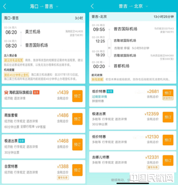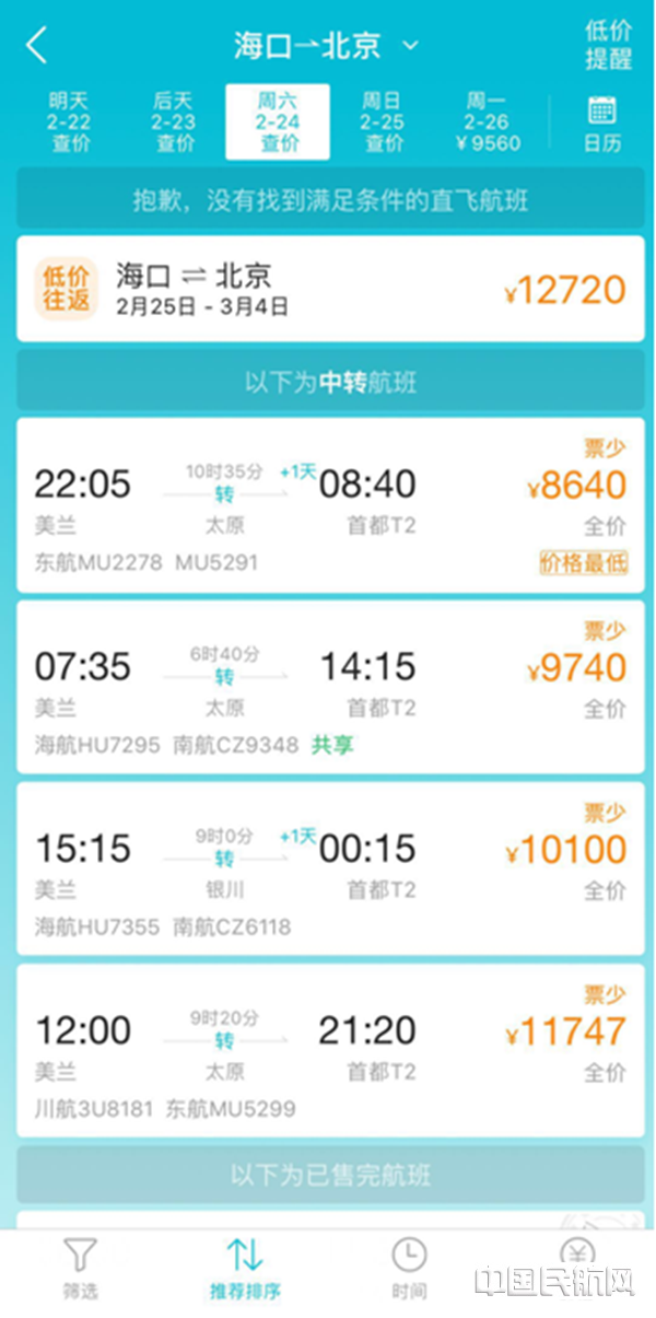 两段行程加起来最低价格不过4655元,比从海口直接回北京机票便宜近一半。
