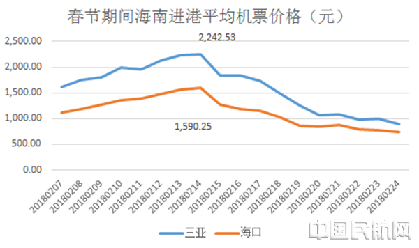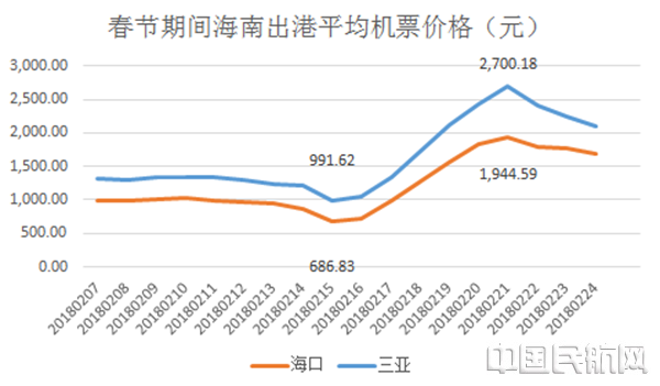 去哪儿机票数据平台显示,海南进港的航线机票平均价格在大年三十达到峰值 以北京为例,早在去年12月19日预定2018年春节前三天前往海南的机票,平均价格均已超全价经济舱:到三亚航线的平均价格达到5923.33元,到海口的略便宜、也已达4951.67元。 而同一天预订返程高峰时从三亚回北京航线的平均机票价格已达8814.33元,从海口回北京航线的平均机票价格也达到8150.33元。 海南的春运返程购票高峰与去程几乎同时。 从境外中转便宜一半 从海南直飞回哪儿都贵?不尽然。 去哪儿机票数据显示,与其花上万买票回京,不如从境外中转。例如在去哪儿平台上搜索,2月23日从海口出发至北京仅剩少量中转航线的机票,机票价格最低也要8640元。