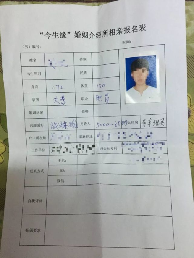 找孙荣华保媒的年轻人填写的表格。新京报记者王婧祎 摄