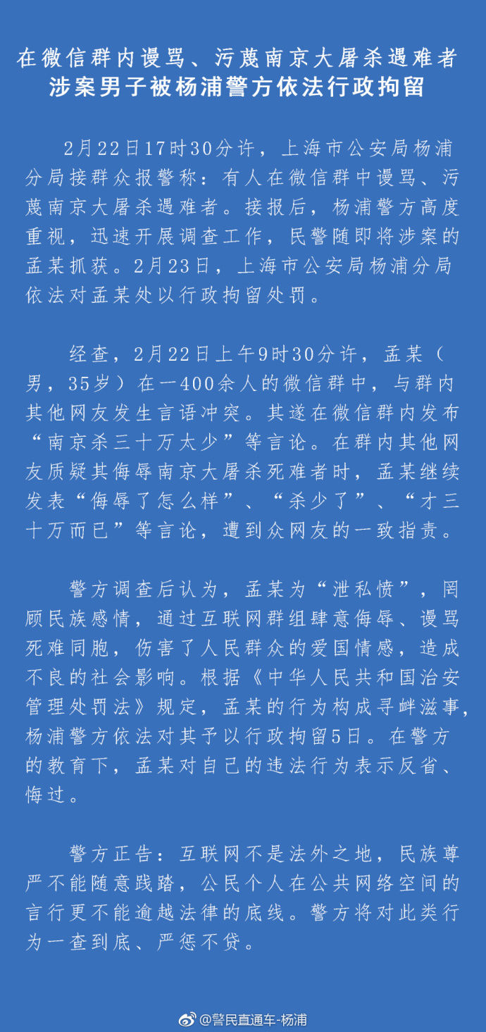 警方通报 2月22日17时30分许,上海市公安局杨浦分局接群众报警称:有人在微信群中谩骂、污蔑南京大屠杀遇难者。接报后,杨浦警方高度重视,迅速开展调查工作,民警随即将涉案的孟某抓获。2月23日,上海市公安局杨浦分局依法对孟某处以行政拘留处罚。 经查,2月22日上午9时30分许,孟某(男,35岁)在一400余人的微信群中,与群内其他网友发生言语冲突。其遂在微信群内发布“南京杀三十万太少”等言论。在群内其他网友质疑其侮辱南京大屠杀死难者时,孟某继续发表“侮辱了怎么样”、“杀少了”、“才三十万而已”等言论,遭到众网友的一致指责。 警方调查后认为,孟某为“泄私愤”,罔顾民族感情,通过互联网群组肆意侮辱、谩骂死难同胞,伤害了人民群众的爱国情感,造成不良的社会影响。根据《中华人民共和国治安管理处罚法》规定,孟某的行为构成寻衅滋事,杨浦警方依法对其予以行政拘留5日。在警方的教育下,孟某对自己的违法行为表示反省、悔过。